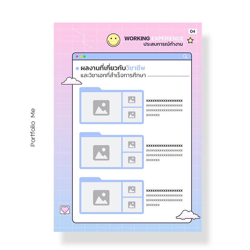 • ผลงานงานที่เกี่ยวข้องกับวิชาชีพและวิชาเอกที่สำเร็จการศึกษา