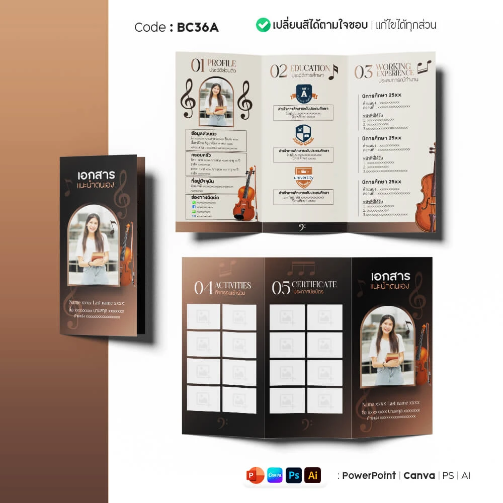 แผ่นพับเราใช้ได้กับครูผู้ช่วยทุกสังกัด หรือใช้สมัครงานราชการ (อปท.) ก็ได้ เพราะเป็นเทมเพลตที่สามารถแก้ไขได้อย่างยืดหยุ่น ปรับแต่งให้ตรงตามเกณฑ์ของงานนั้น ๆ ได้เลย โดยแผ่นพับเป็น ขนาด 4A แนวนอน พับแบบ 2 ทบ 3 ตอน (Tri Fold) ประกอบด้วยหน้าดังนี้