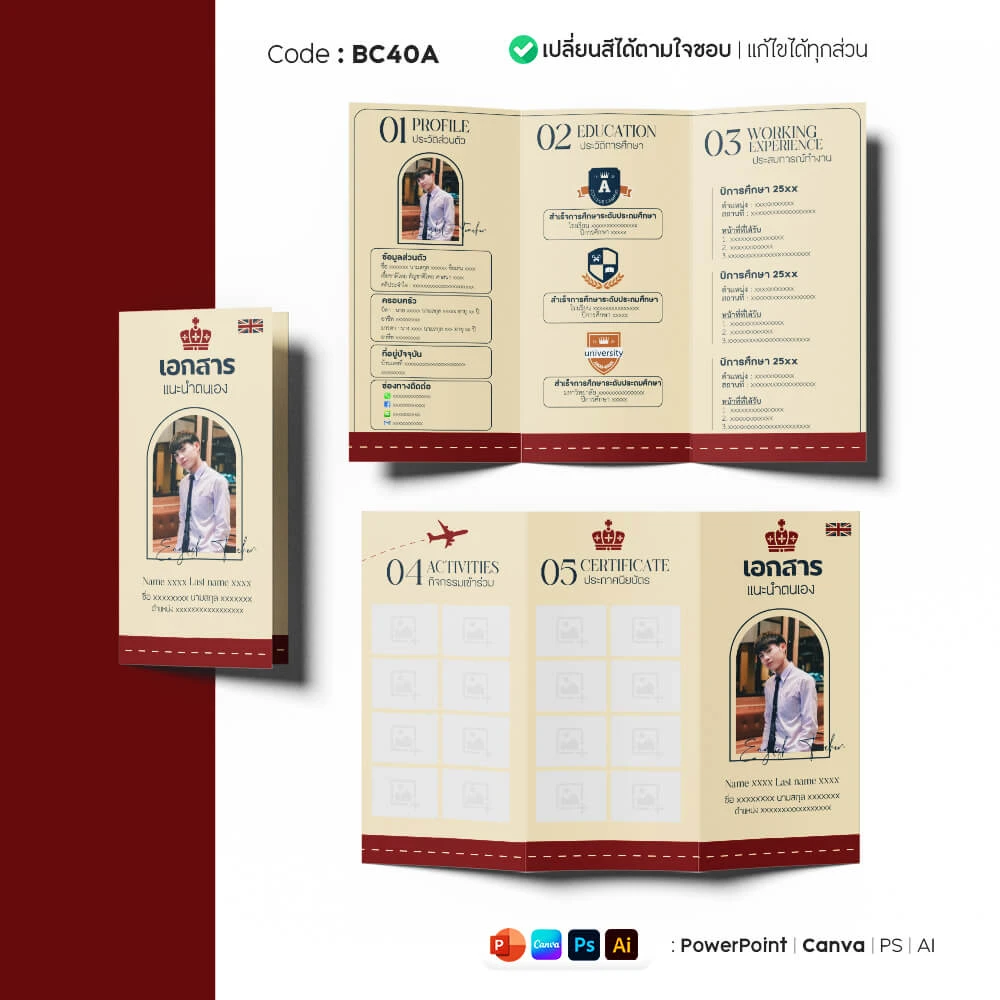 แผ่นพับเราใช้ได้กับครูผู้ช่วยทุกสังกัด หรือใช้สมัครงานราชการ (อปท.) ก็ได้ เพราะเป็นเทมเพลตที่สามารถแก้ไขได้อย่างยืดหยุ่น ปรับแต่งให้ตรงตามเกณฑ์ของงานนั้น ๆ ได้เลย โดยแผ่นพับเป็น ขนาด 4A แนวนอน พับแบบ 2 ทบ 3 ตอน (Tri Fold) ประกอบด้วยหน้าดังนี้