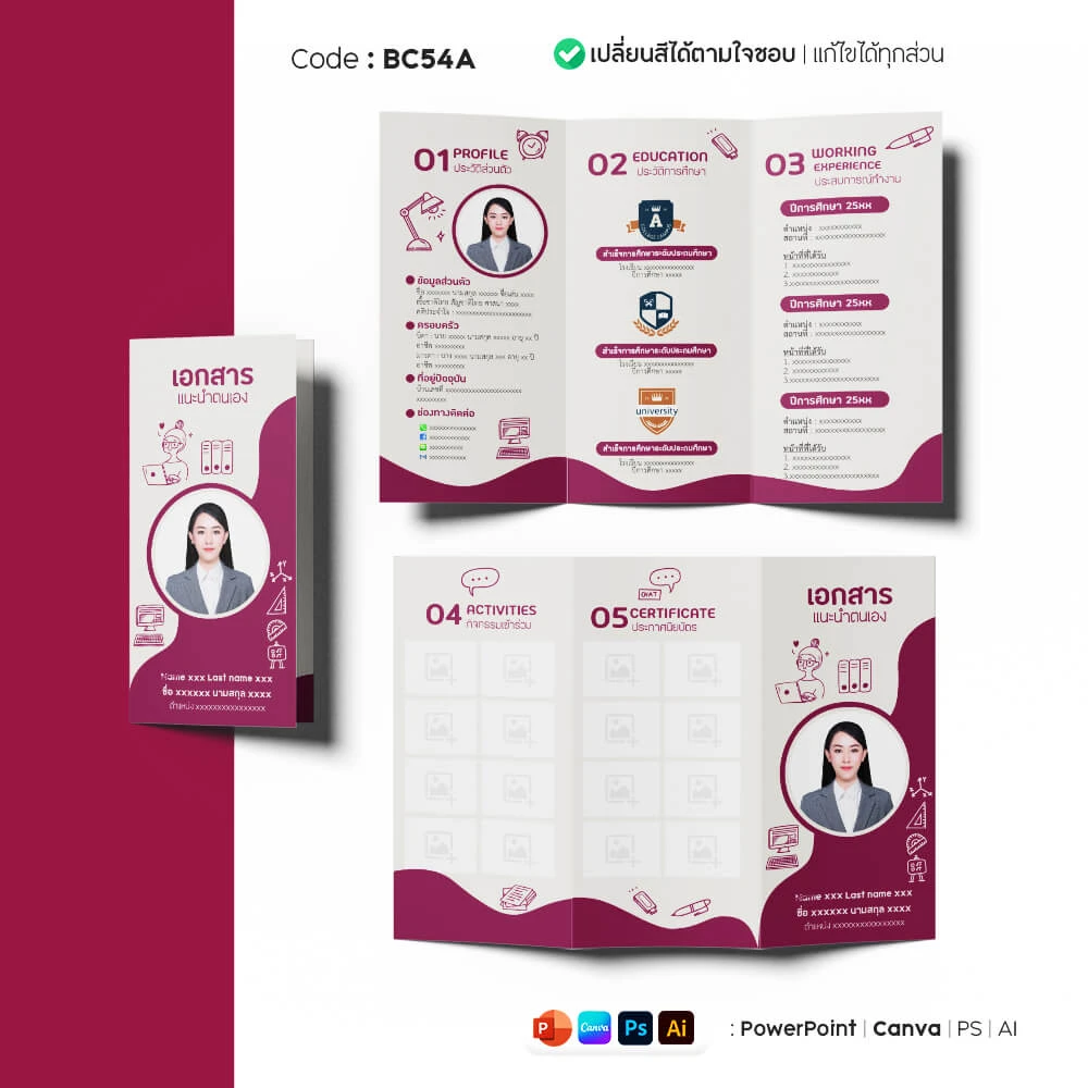 แผ่นพับเราใช้ได้กับครูผู้ช่วยทุกสังกัด หรือใช้สมัครงานราชการ (อปท.) ก็ได้ เพราะเป็นเทมเพลตที่สามารถแก้ไขได้อย่างยืดหยุ่น ปรับแต่งให้ตรงตามเกณฑ์ของงานนั้น ๆ ได้เลย โดยแผ่นพับเป็น ขนาด 4A แนวนอน พับแบบ 2 ทบ 3 ตอน (Tri Fold) ประกอบด้วยหน้าดังนี้